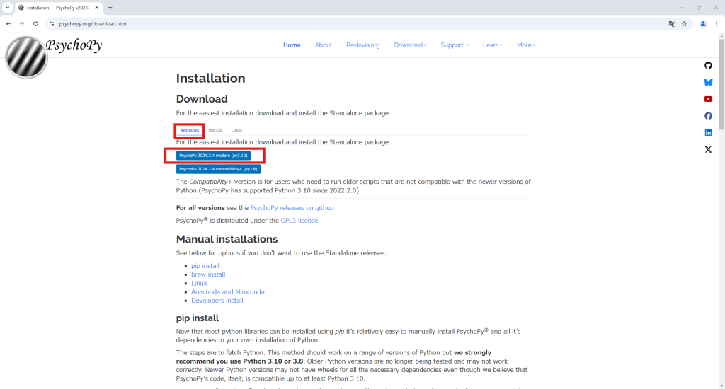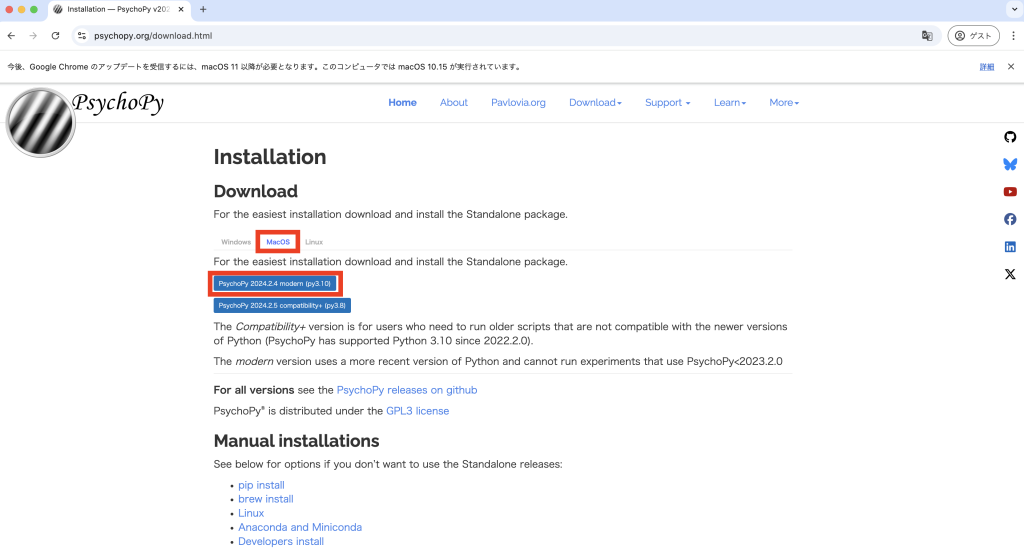 - PsychoPy公式サイトのダウンロードページ(https://www.psychopy.org/download.html)にアクセスする