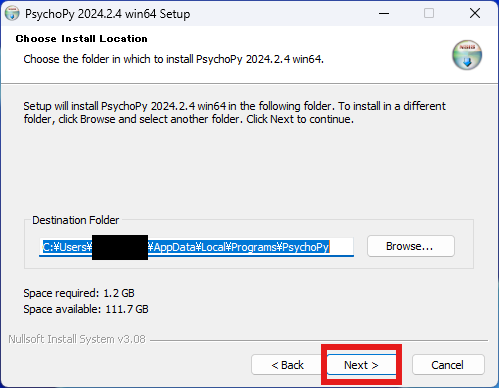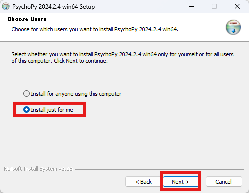 自PCの他のユーザがPsychoPyを使用する必要がない場合は、「Install just for me」を選択してください。