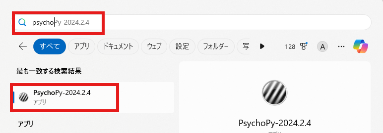 スタートでPsychoPyを検索して起動し、以下の画面が表示されていればOKです。