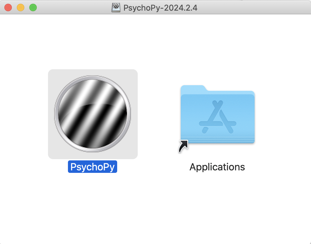 - 表示されたウィンドウ内のPsychoPyアプリケーションをApplicationsフォルダにドラッグ&ドロップする
